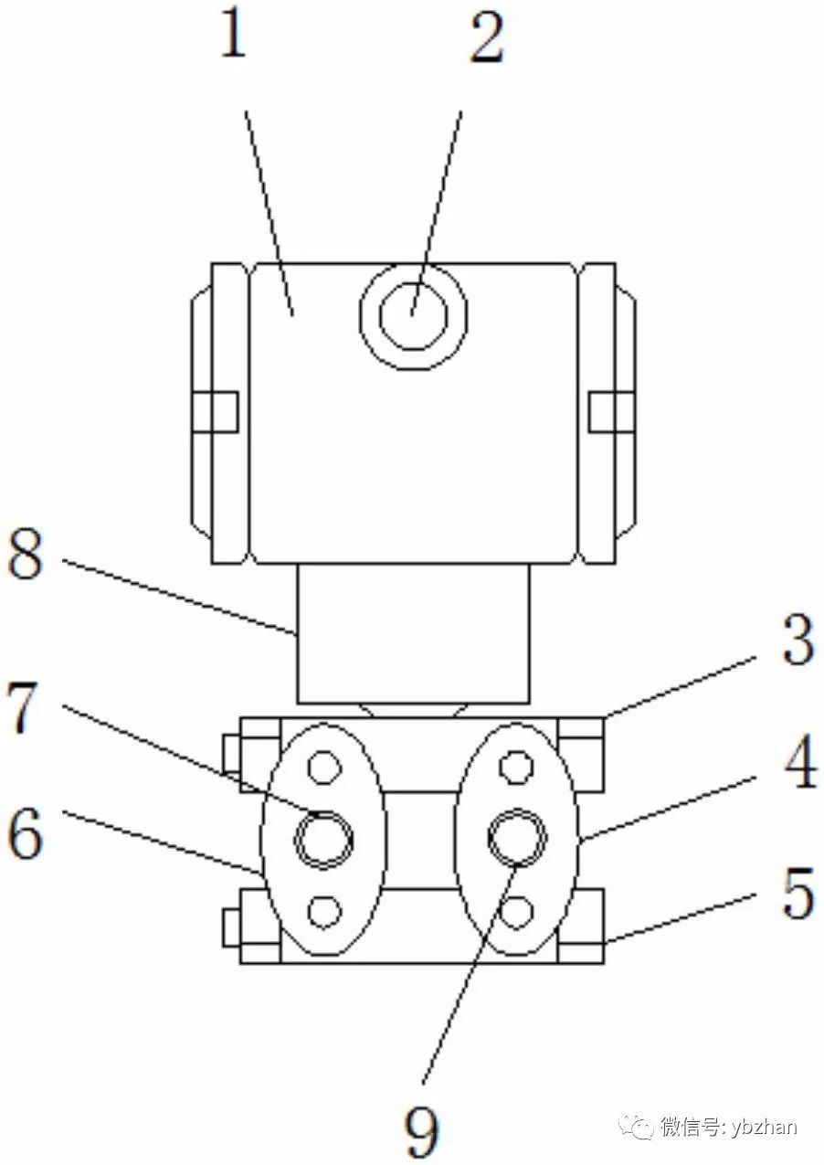 與現有技術相比,本實用新型結構設計合理,數據檢測效果好,精度和穩定性高;安裝腔內設有中心測量膜片,中心測量膜片兩側填充矽油,壓力通過隔離膜片傳遞到中心測量膜片,並填充矽油引起位移,中心測量膜片與兩個電容板之間的電容差通過電子元器件轉換成4-20 ADC雙線製輸出的電信號,信號傳輸的及時性更快,穩定性更高;第一螺栓連接在第一法蘭管和第二法蘭管的頂部,第二螺栓連接在第一法蘭管和第二法蘭管的底部,增加了流室的固定效果,安裝方便。提供剛性絕緣體以增加內部絕緣效果。